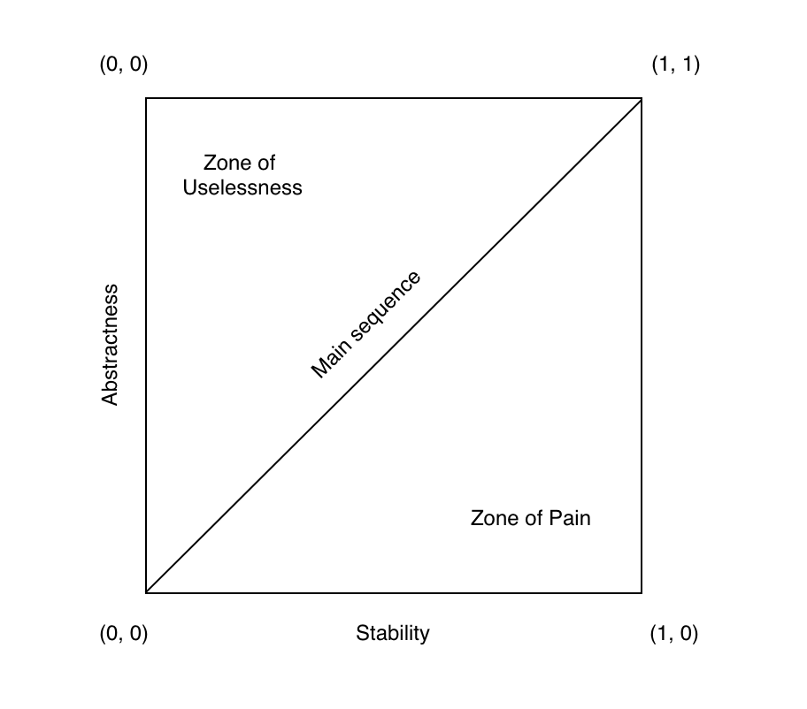 Zone of pain is where our code is highly volatile and concrete, which means that any change is hard to implement and we don’t know the impact it may have on other parts of the code.