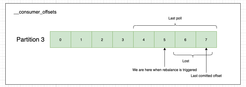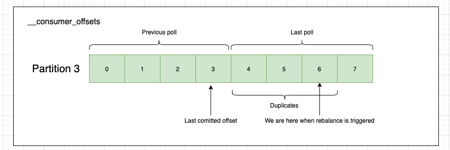 Let’s assume the new consumer(consumer 3) gets partition 3 (partition.assignment.strategy). The previous consumer (consumer 1) has committed offset 3(from previous poll) and was working on offset 6(current poll). The auto-commit interval did not pass, so no auto-commit was performed since message 3. The new consumer then looks for the last committed offset and find it at position 3. If if wouldn’t had found one, it would default to latest offset in the partition (auto.offset.reset). Obviously the new consumer will start from offset 3 meaning that offsets 4-6 will be reprocessed. We can fix this be implementing the idempotent receiver pattern.